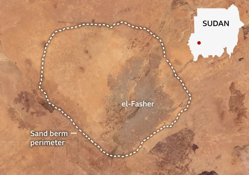 Satellite images show that troops started to construct a massive berm – a raised sand barrier – around the perimeter of el-Fasher, sealing off access routes and blocking aid. By early October the ring completely surrounded the city – with a smaller barricade encircling a neighbouring village.