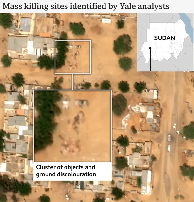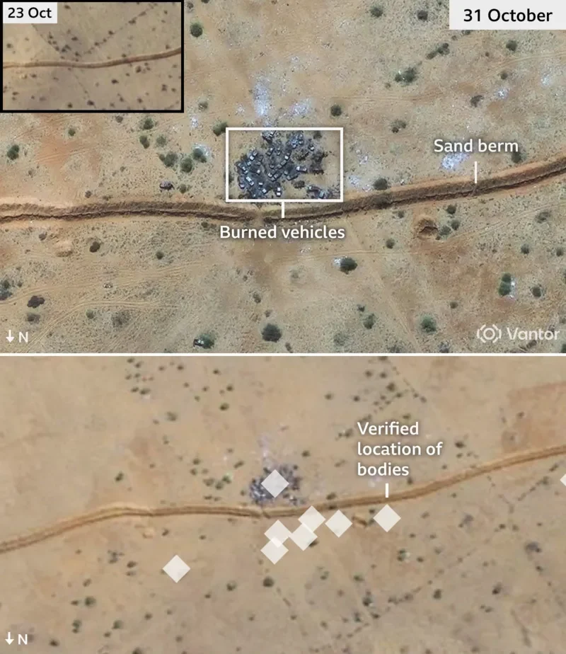 Satellite images taken on 26 October appeared to confirm that executions were also carried out on the streets of el-Fasher, according to a report published by the Yale Humanitarian Research Lab.